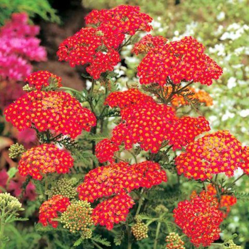 Achillea Paprika produces bright Red flowers that brighten up any sun-loving garden all summer long! Intense red flowers surround bright yellow centers. It is one of the most floriferous of the Achillea cultivars, presenting a solid block of red in early summer.